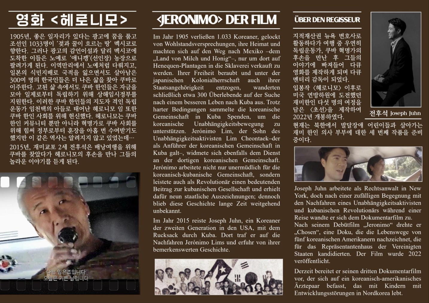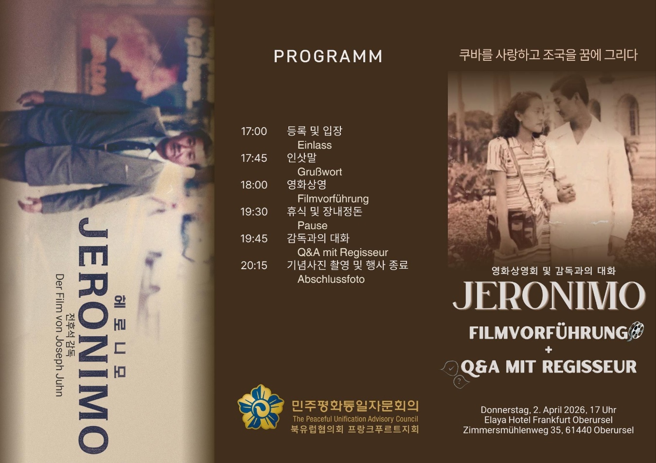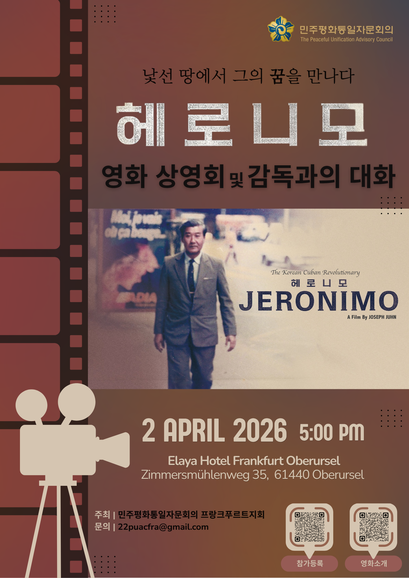 민주평화통일자문회의 프랑크푸르트지회는 4월 2일(목) 17:00, 오버우어젤에 위치한 Elaya Hotel Frankfurt Oberursel에서 다큐멘터리 영화 「헤로니모(JERONIMO)」 상영회 및 감독과의 대화 행사를 개최합니다.